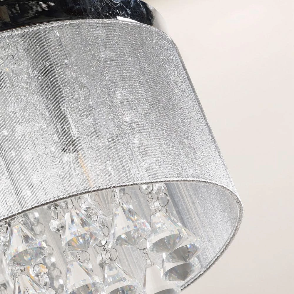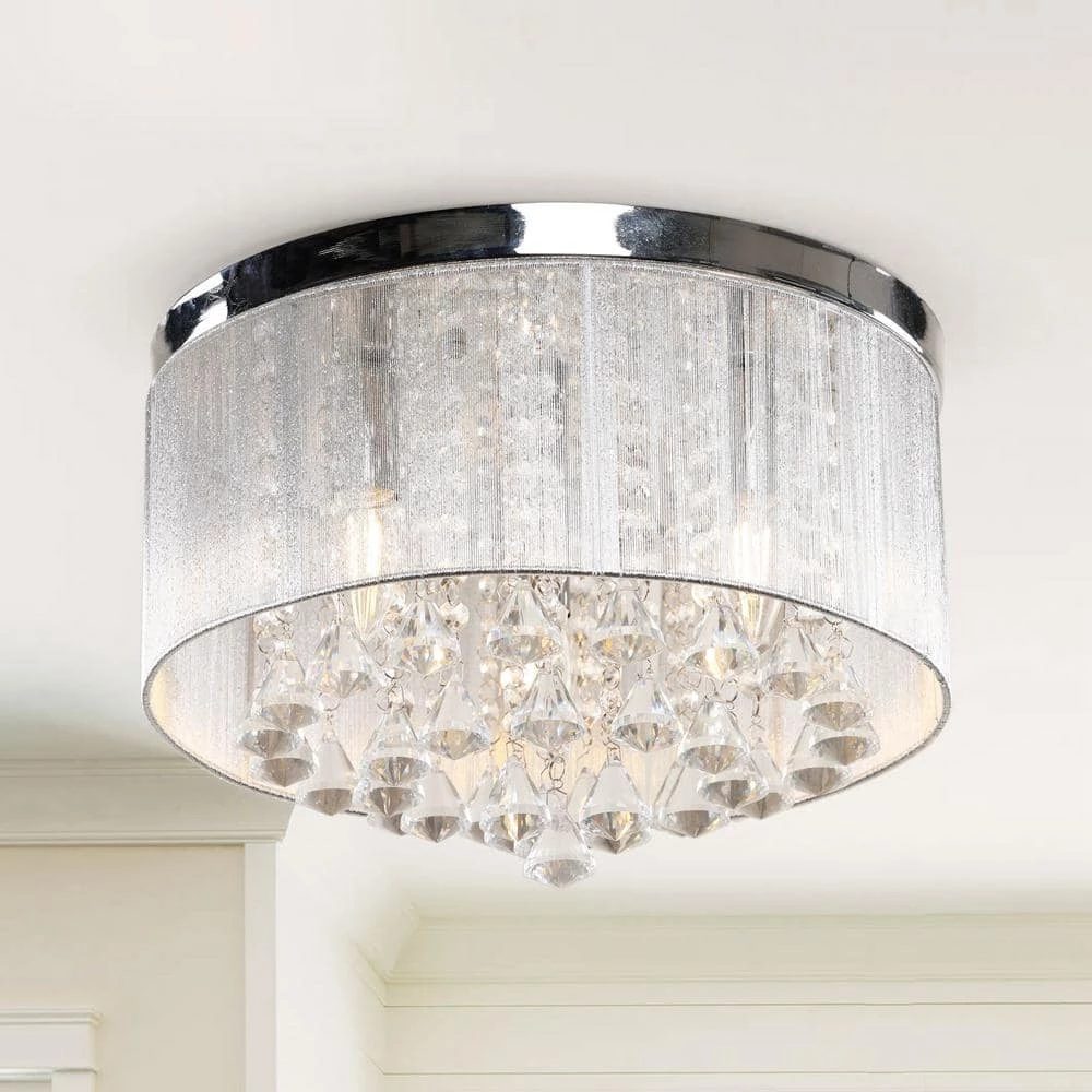 This flush mount ceiling light is defined by the medley of crystal droplets that hang from the canopy. Add timeless elegance to your living space with this contemporary crystal ceiling light. The sparkling shade is made of glass crystal prisms and faceted round accents, which throws the light around in a spectacular manner. The chrome finish metal adorns the top flush-mount design.