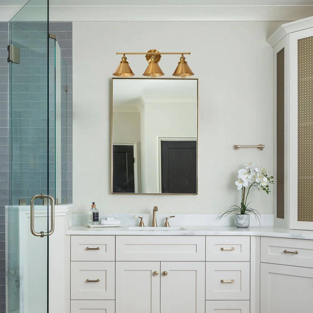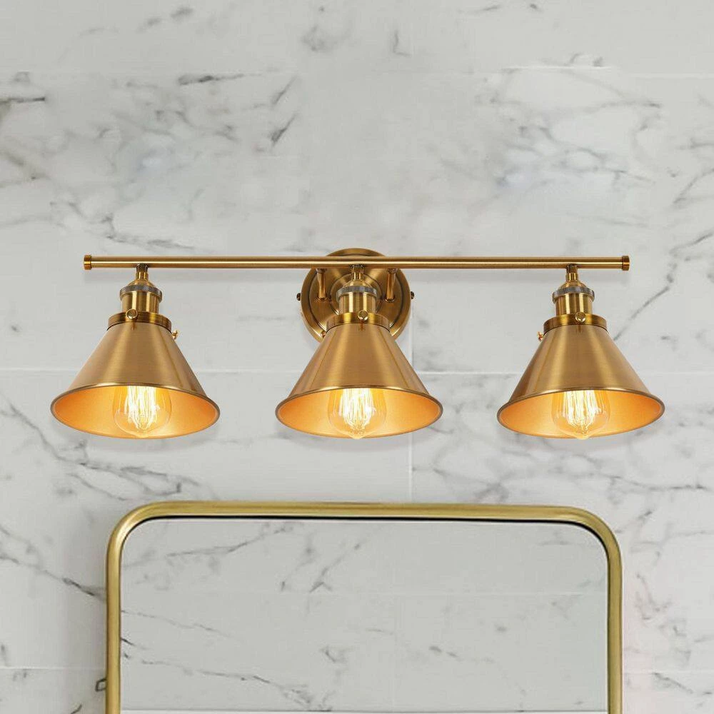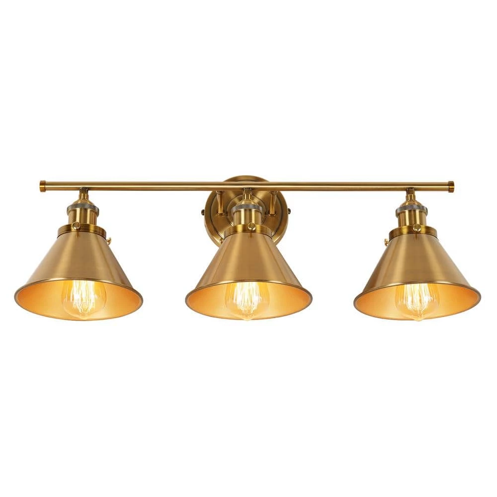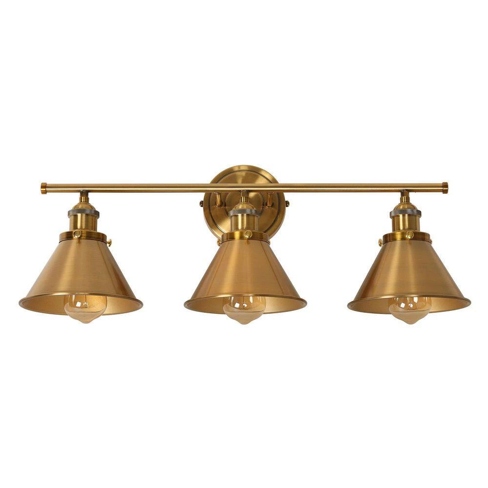 This 26 in. 3-light Vanity Light offers a clean modern design to complement any decor. Its streamlined hooded shades are eye-catching and offer a versatile style that accommodates many spaces. It comes in a warm gold finish metal frame, which pairs a simple body with classic triangular shades, perfect for contemporary and vintage-style settings.