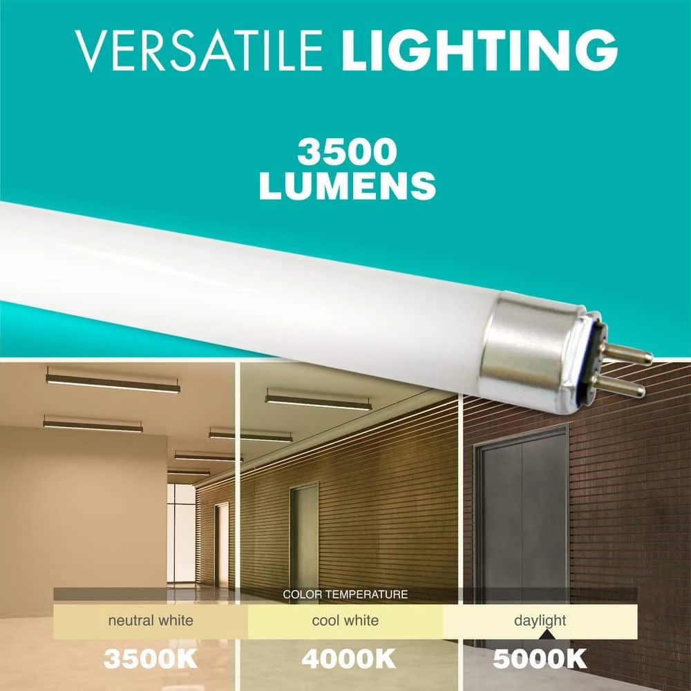 Get powerful illumination for low energy costs with our Simply Conserve 45.8 in. Linear T5 LED Tube Light Bulb. This damp-rated, energy-saving LED bulb is ideal for enclosed indoor fixtures. You get a 25-watt LED light bulb with the equivalent output of a 54-watt traditional fluorescent light bulb. That’s significant energy cost savings for reliable lighting that lasts for 50,000 hours of continuous use. You get the same 3500-lumen output of a comparable fluorescent tube but free of the yellowing and bending that comes with older T5 bulbs. Type A technology makes this the ideal solution for converting all of your existing fixtures to LED. The 45.8 in. LED bulb can plug and play into an existing compatible ballast for your convenience. You get a strong, quick and safe installation without needing to rewire the ballast or fixture. It’s compatible with most electronic instant-start and programmed-start T5 ballasts so you get an easy setup for durable illumination that lasts for years. Our energy-efficient 5000K LED bulb comes in a full glass housing that allows the unit to run cool with minimal heat output. It’s mercury-free for peace of mind, springs to life in less than a second and it’s flicker-free so you will always have steady reliable lighting. Our LED replacement for fluorescent tubes is well-suited to offices, conference rooms, hotels, academic complexes and commercial and medical facilities. RoHS compliant and cULus listed and it comes with a limited 5-year warranty.