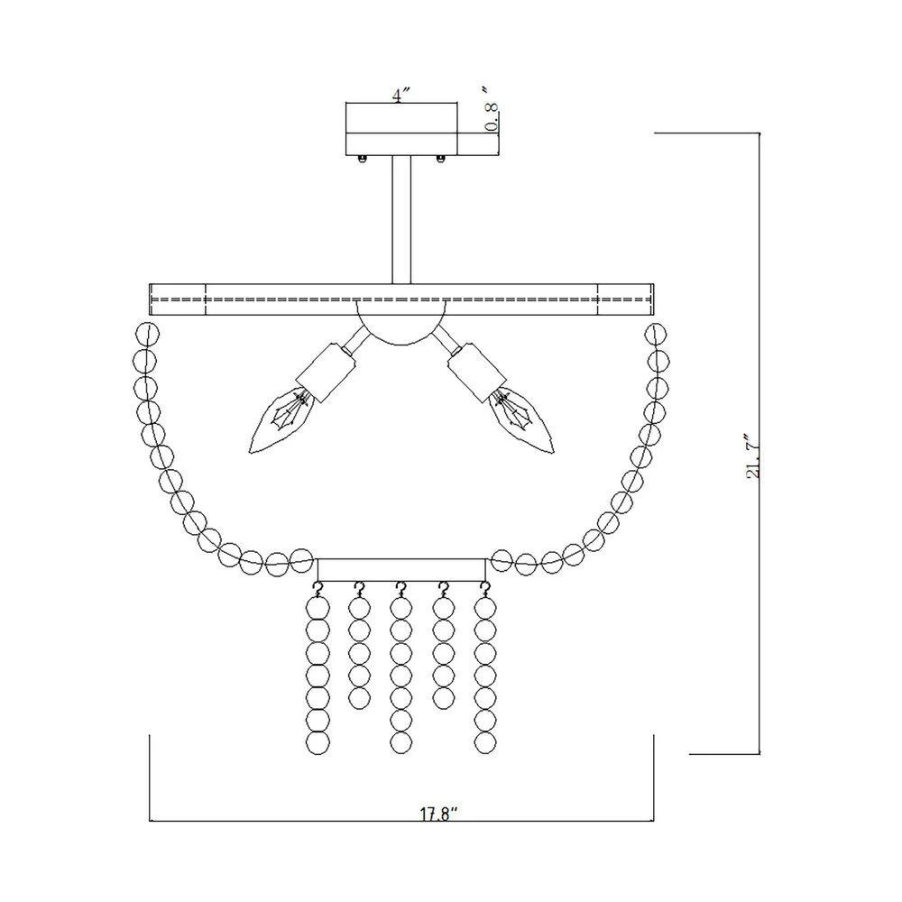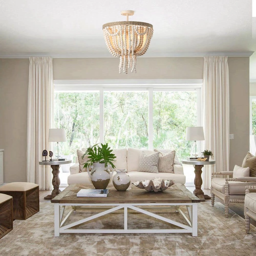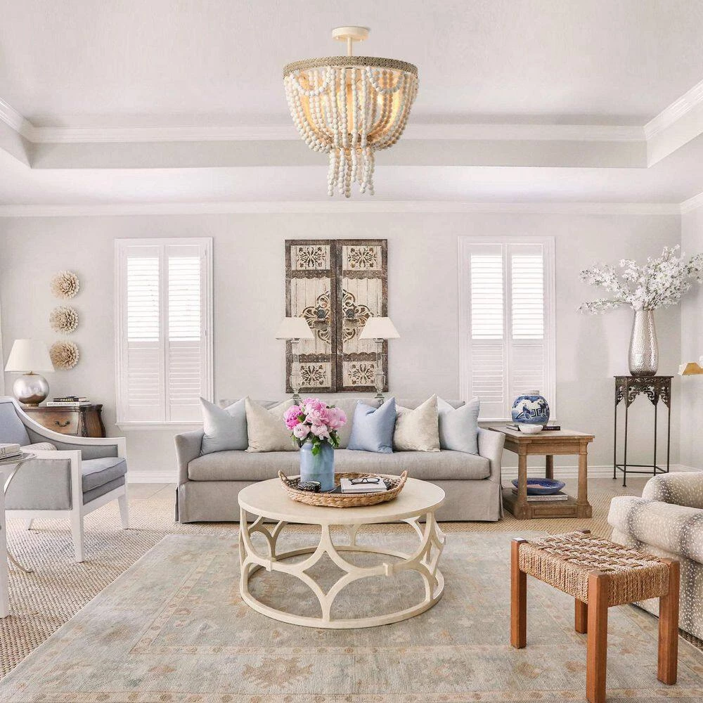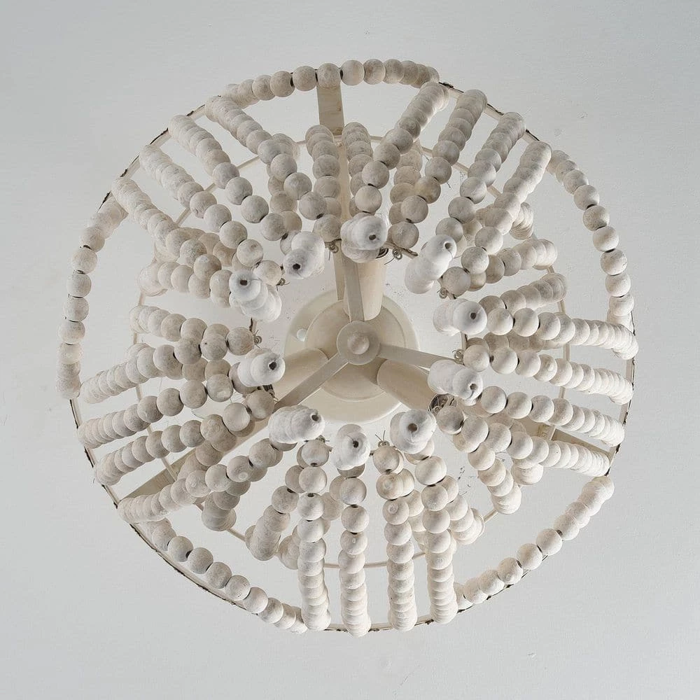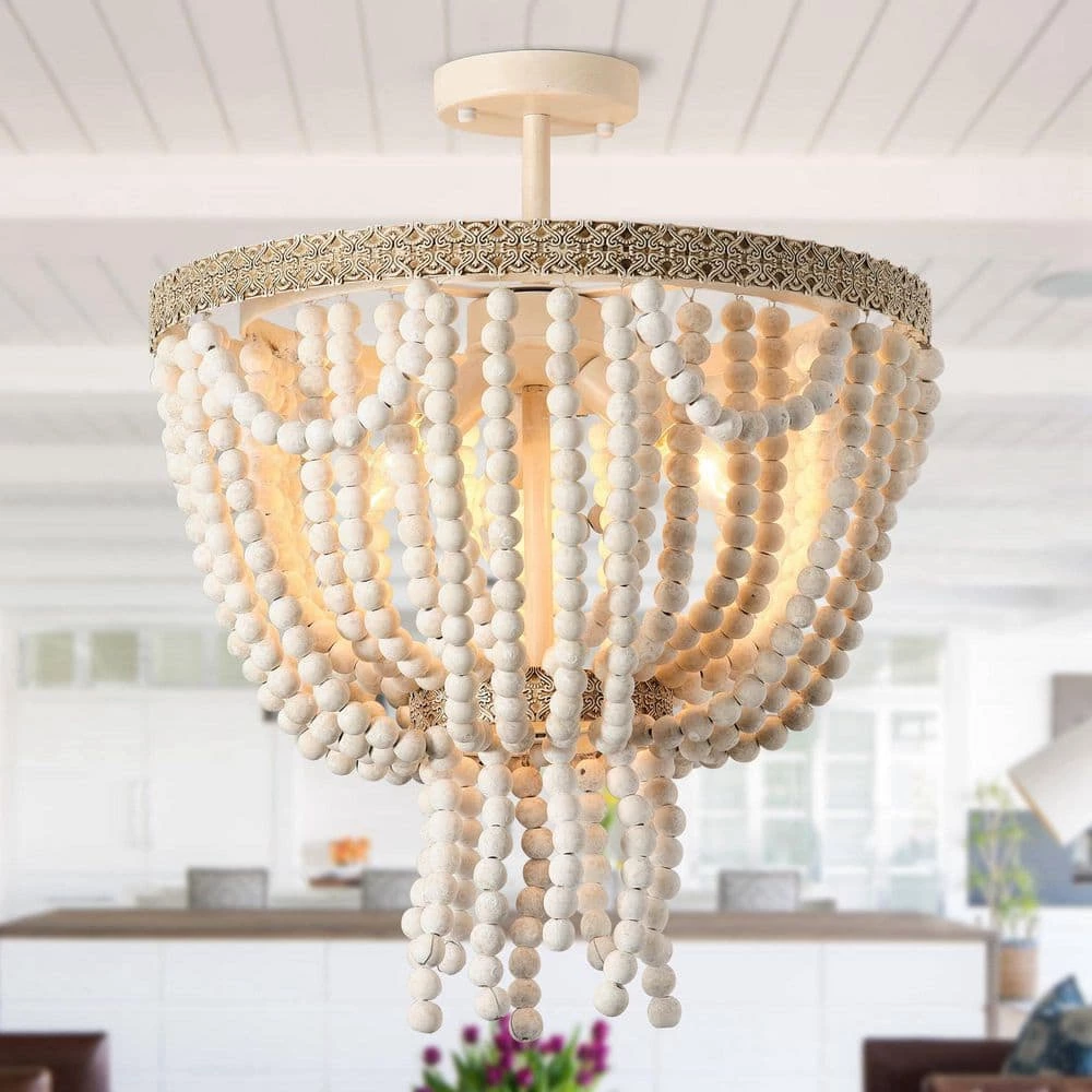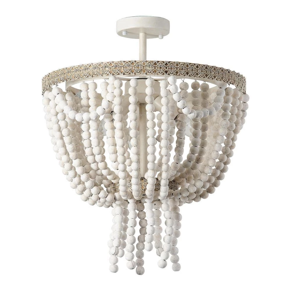Elegantly designed, this rustic extra-large semi-flush mount ceiling light features a distressed white finish and wooden beaded. A circular-shaped frame of hand-painted antique metal gives this piece some character. Three candelabra-base 40W bulbs (sold separately) within the strings of beads cast a warm glow throughout your space.