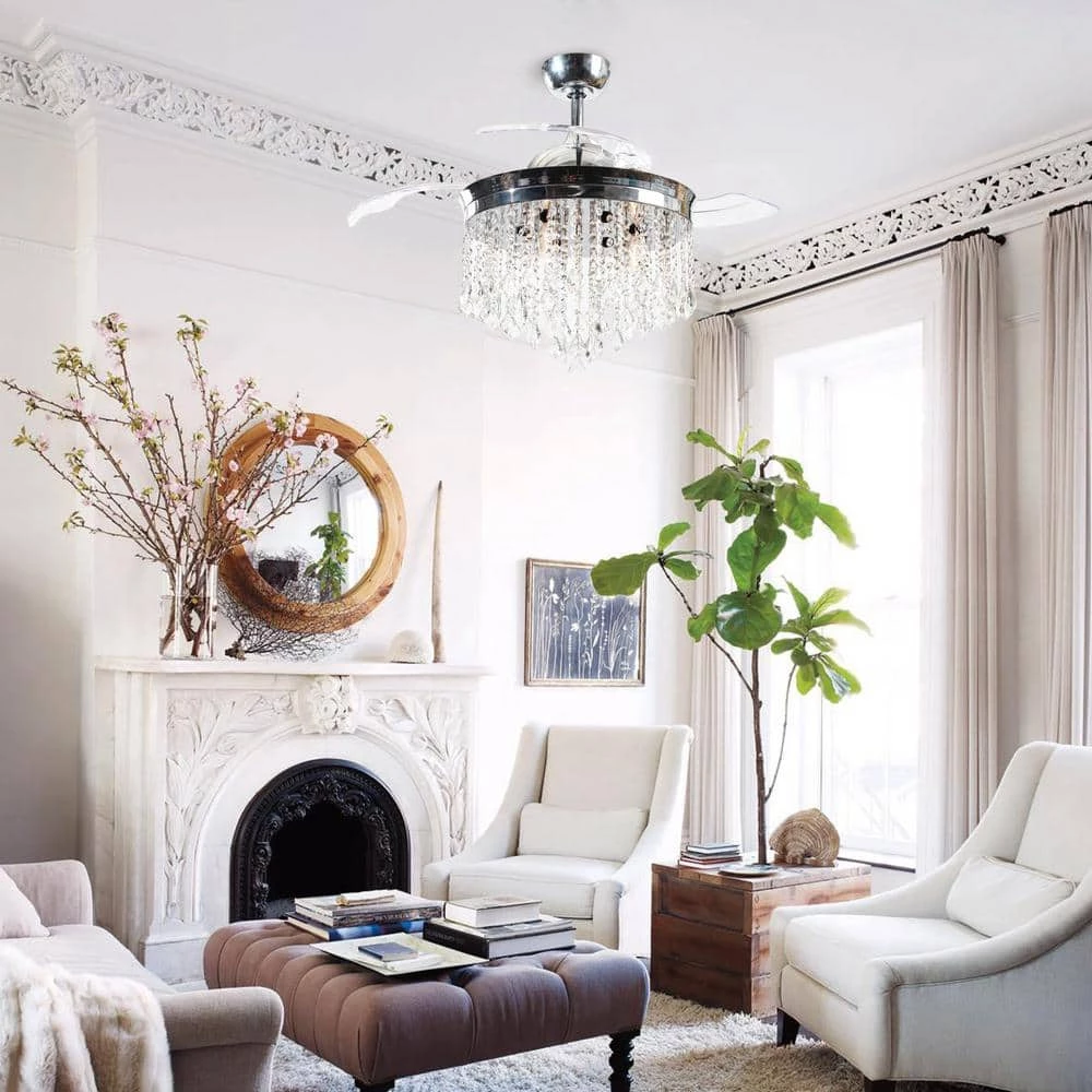 The 42 in. ceiling fan is a functional and elegant all-in-one. The fandelier features 3 retractable blades and dangling crystal accents. The fan blades automatically retract and conceal with remote control, meanwhile, 3 speeds and light can be controlled separately. Keep your room cool, bright, and stylish at the same time with this eye-catching fan and light kit. 4 in. and 10 in. included, is better to fit your ceiling mounting.
