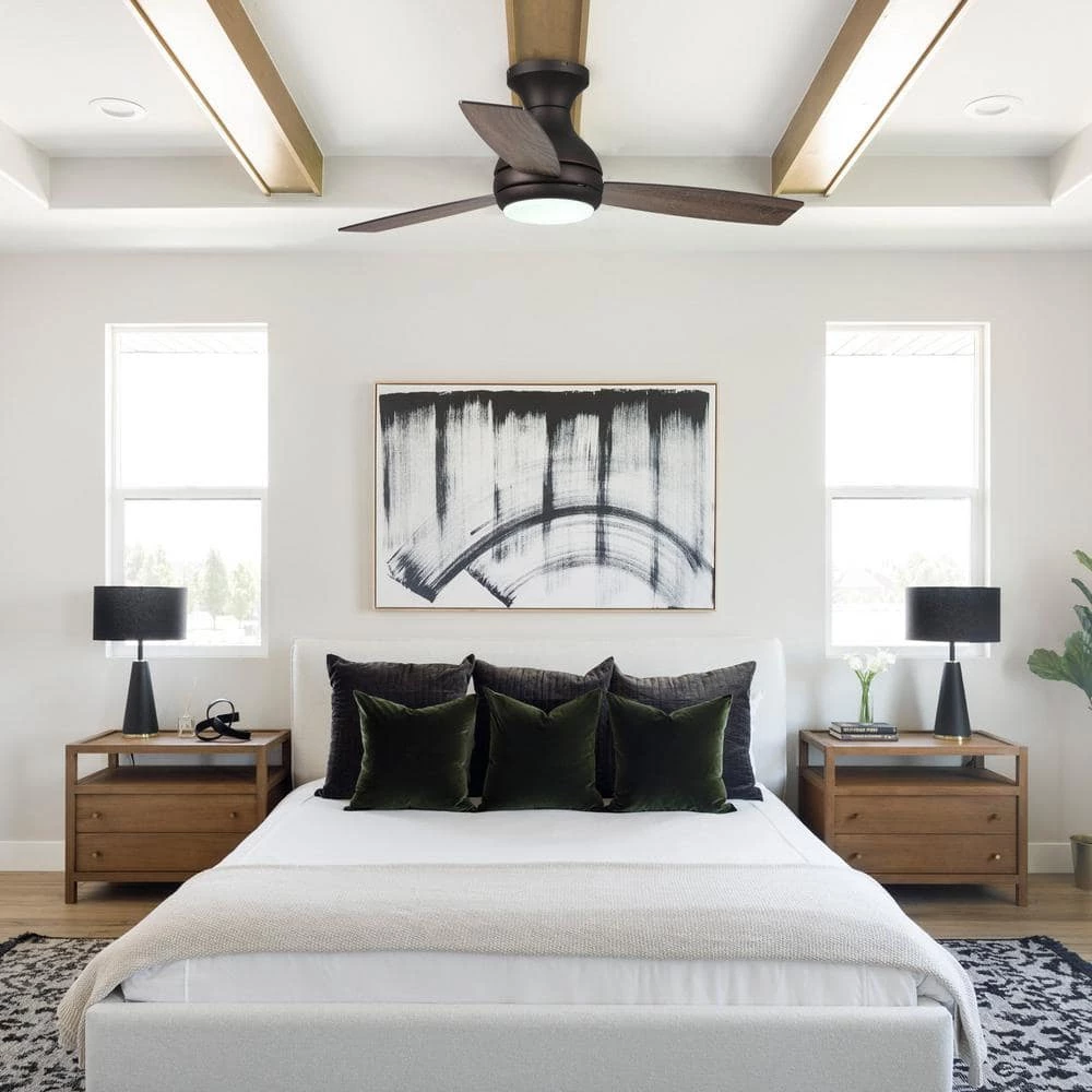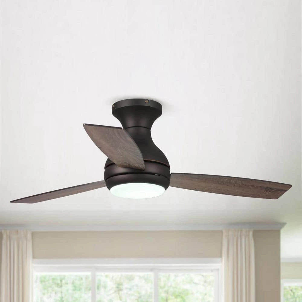 This 48. in low-profile flush mount LED ceiling fan is great for rooms with low ceiling heights. The bronze finish fan features 3 brown finish wooden blades and a white glass LED light to complete the design. Control the light and fan with the included handheld remote control.
