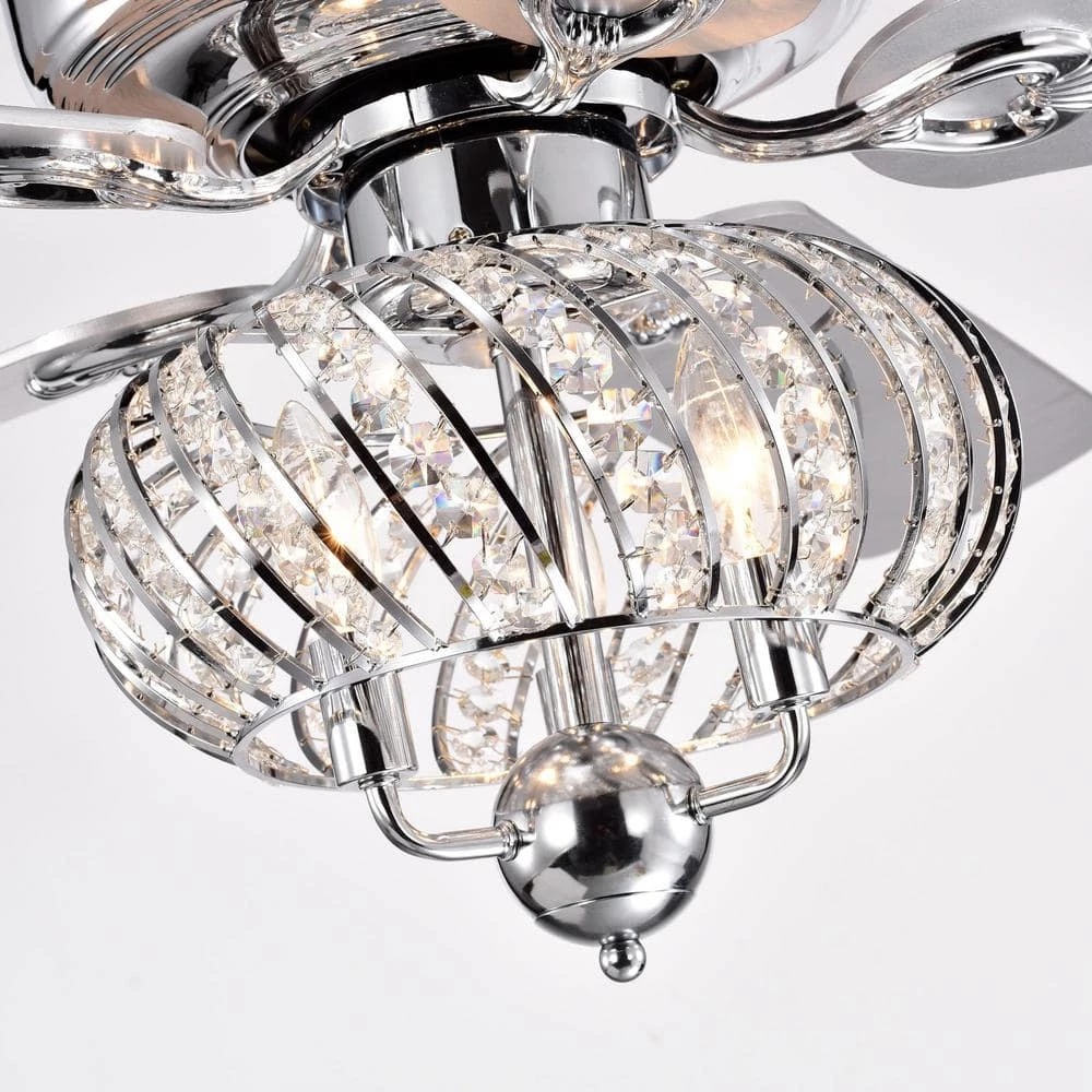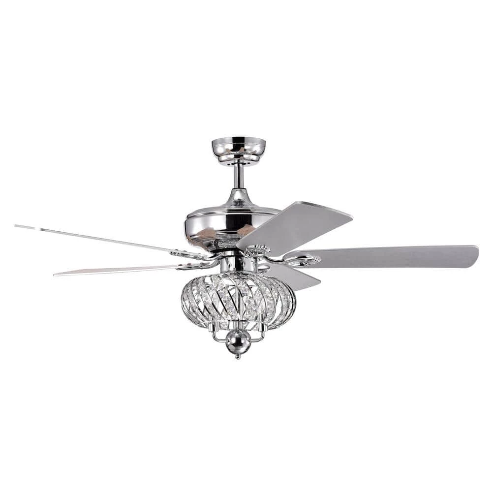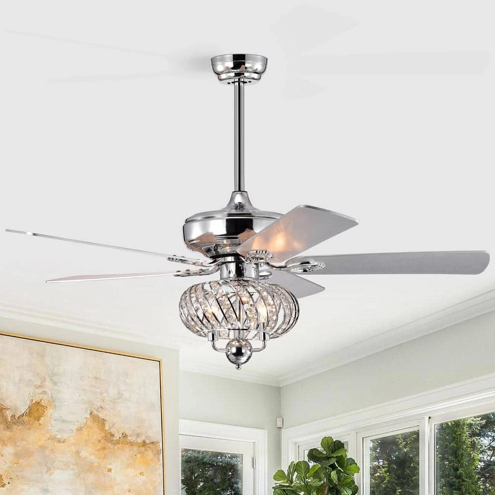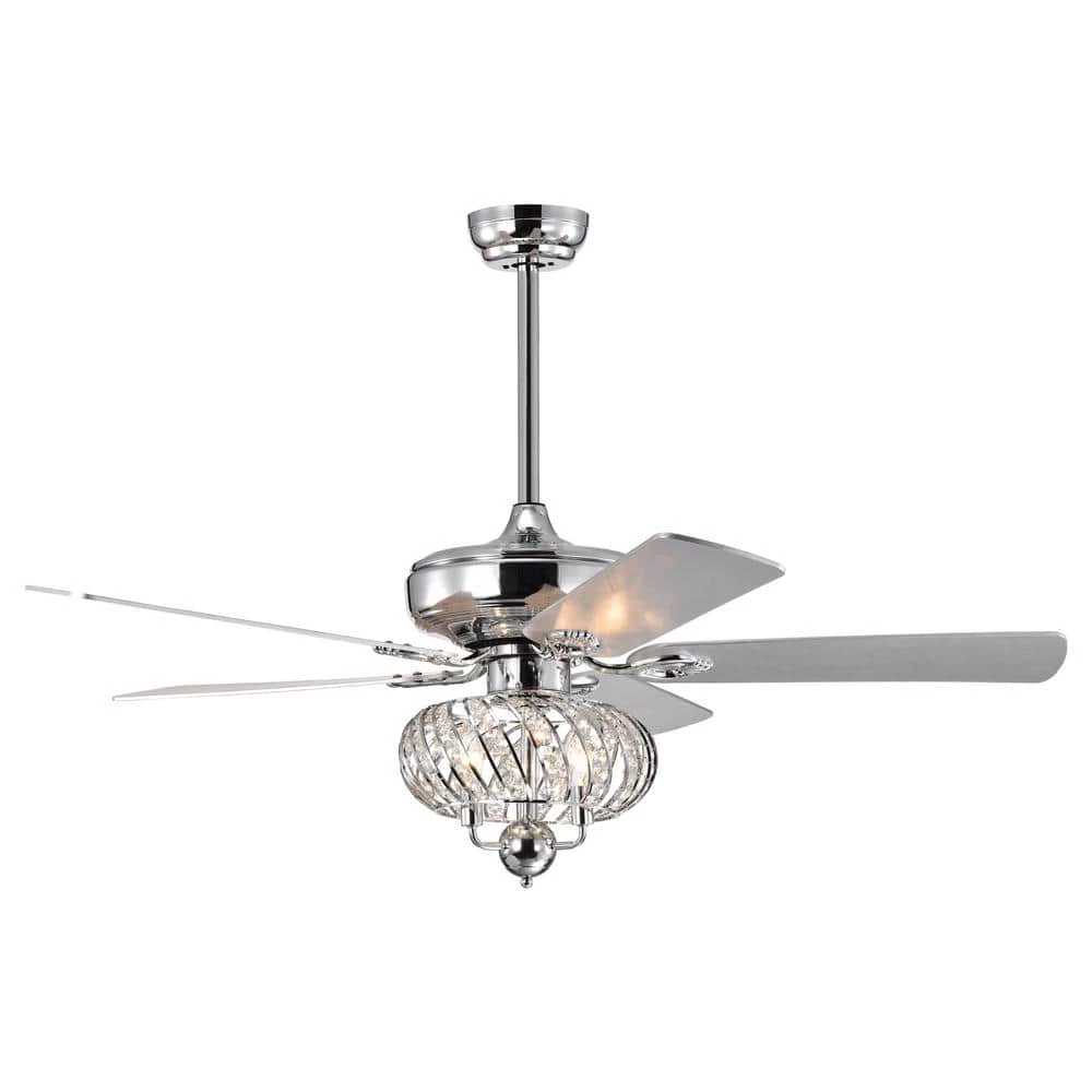 The 50 in. crystal ceiling fan is a perfectly pretty addition to your home decor. A full crystal shade combines to fill your home with a grandeur rarely found in such a functional package. The matching wood blades move an impressive amount of air. The 3 candelabra light bulbs (not included) add the finishing touch. The 3-speed motor ensures you find the exact setting for your stimulating comfort. When warmer days come around, ceiling fans like this are a great option for keeping a room cool, and when cool days, manual reserve blades can make the air warm. This chrome fan includes a remote control so you can control the breeze without getting up.