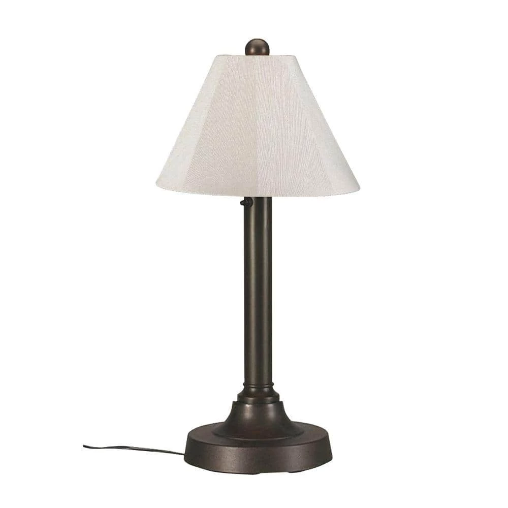 All weather resin San Juan table lamp adds practicality and style to your outdoor living area. Its heavy weighted base and 2 in. body elicit a simple yet refreshing and functional accent. Features a two level dimming switch and a 14 in. Dia shade covered with durable Sunbrella fabric. A 16 foot weatherproof cord and plug provide added safety and convenience. Durable acrylic waterproof light bulb enclosure allows use of a standard 60-Watt bulb or comparable LED and fluorescent bulbs.
